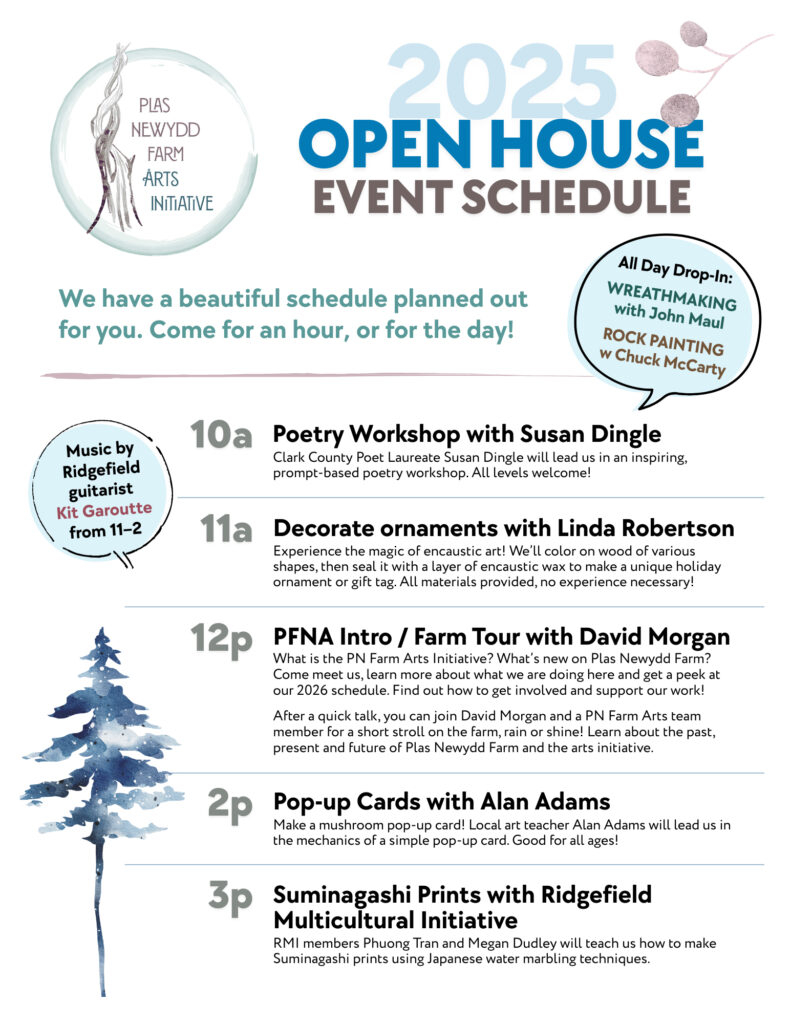 Please join us Saturday, December 13th, between 10am–4pm for a drop-in open house in the Plas Newydd farmhouse. We will have warm drinks, snacks, and an array of hands-on arts & crafts activities, including wreath-making, writing, rock painting and more. Come for an hour, or come for the whole day!Learn about what we’ve been up to this year, and get a sneak preview of what’s coming your way in 2026.